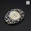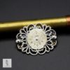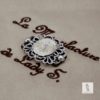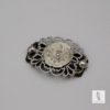 Il se clispe grâce à un petit peigne noir. J’ai monté sur celui-ci une estampe filigranne ovale de couleur argentée sur laquelle j’avais vissé un véritable cadran de montre oval gris.
