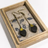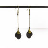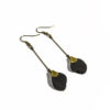 Boucles d’oreilles pendantes en laiton finition doré antique. Charbon de bois japonais poli. Chaque charbon est unique et les dessins du bois sont naturels. Pièce unique.