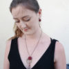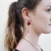 Boucles d’oreilles en cuir délicates et féminines, sculptées à la main en forme de rose, ornées d’une perle en pierre fine au bout d’une chaine en laiton. Elles sont montées sur une dormeuse en laiton.