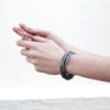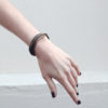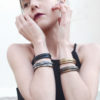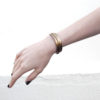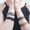 Manchette en cuir métallisé plissé et patiné à la main sur une structure ajustable en laiton. Chaque plissé est légèrement différent, conférant à chaque modèle un caractère unique.