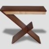 La simplicité du croisement de trois lignes donne à cette console toute sa beauté et sa fonctionnalité. De petites dimensions, elle s’adapte parfaitement à une entrée avec ses 2 tiroirs vide-poches et l’espace porte-revues ou pose-courrier formé par le croisement en X du piètement.