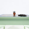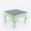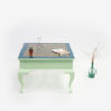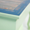 Cette table basse carrée aux pieds galbés est à la fois chic et rustique. Son piètement, pensé dans un vert jeune et doux, soutient un épais plateau nervuré, entièrement revisité au moyen de lattes de lit. Le gris sombre est entouré d’un bleu profond et laisse apparaitre le bois par endroits. Les arêtes du plateau ont été légèrement poncées, et le mettent ainsi en valeur.